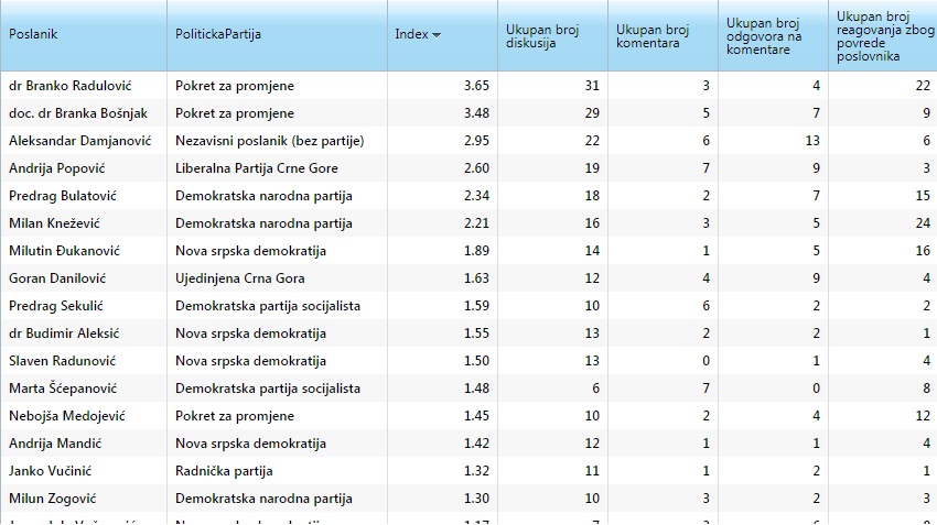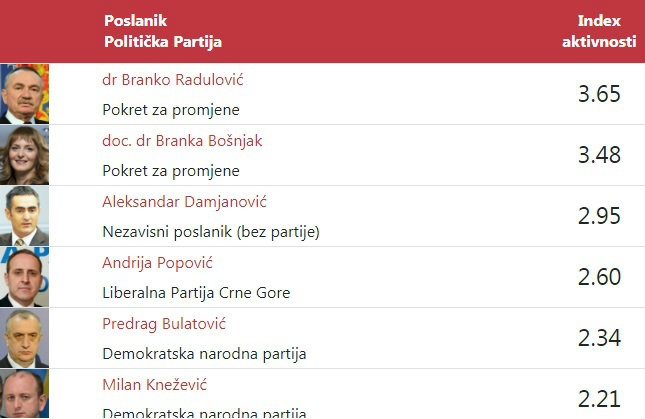 Ova stranica sadži pregled indeksa aktivnosti svih poslanika. Indeks predstavlja sumiranje ukupnog rada poslanika Skupštine Crne Gore na plenarnim sjednicama. Ovaj indeks za svakog od