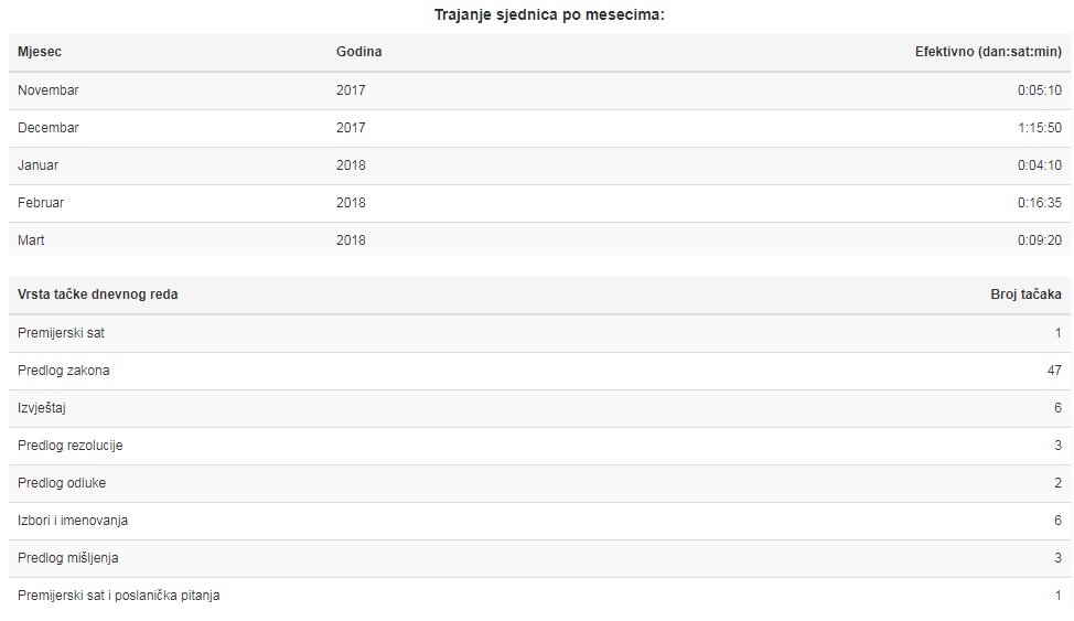 Na ovoj stranici se nalazi pregled održanih sjednica, njihovo trajanje i tačke dnevnog reda. Za svaku od sjednica moguće je pristupiti dnevnom redu kao i
