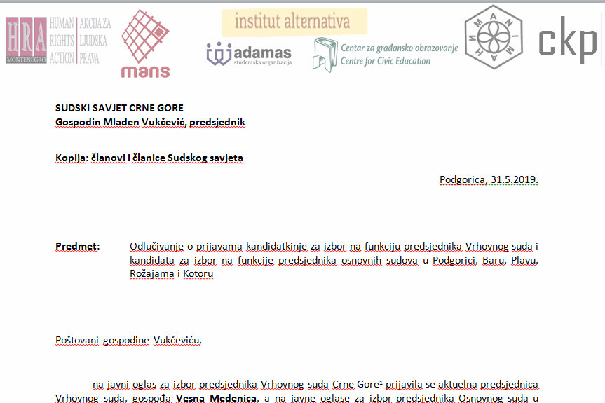 Pismo jedanaest nevladinih organizacija – odlučivanje o prijavama kandidata za predsjednike sudova