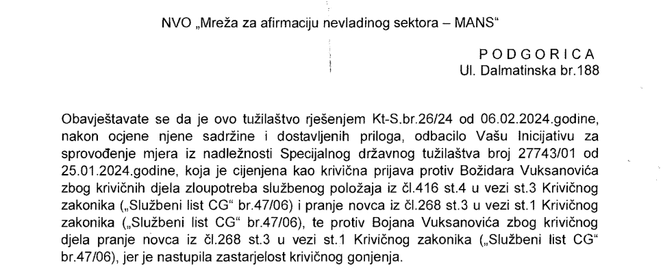 Prvostepenom presudom Osnovnog suda u Podgorici odbijen je kao preuranjen tužbeni zahtjev Đukanovića protiv Agencije za sprečavanje korupcije, kojim je bivši predsjednik tražio naknadu nematerijalne
