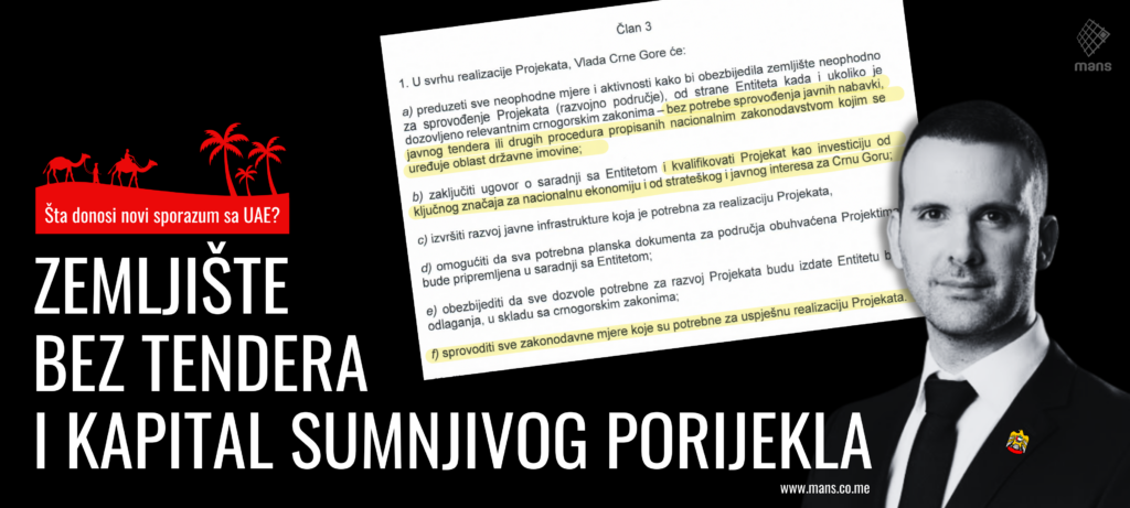 Sporazum o saradnji u oblasti turizma i razvoja nekretnina predviđa da će zemljište za izabrane projekte biti obezbijeđeno “bez potrebe sprovodjenja javnih nabavki, javnog tendera ili drugih procedura propisanih nacionalnim zakonodavstvom kojim se uređuje oblast državne imovine“. To znači da će se državno zemljište prodavati ili izdavati kroz direktne dogovore iza zatvorenih vrata, što otvara ogroman prostor za korupciju.