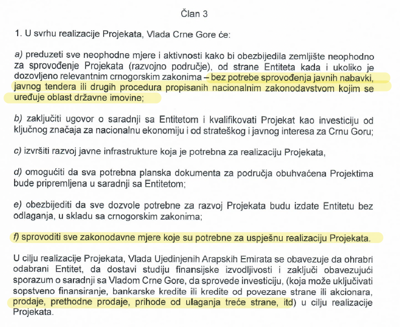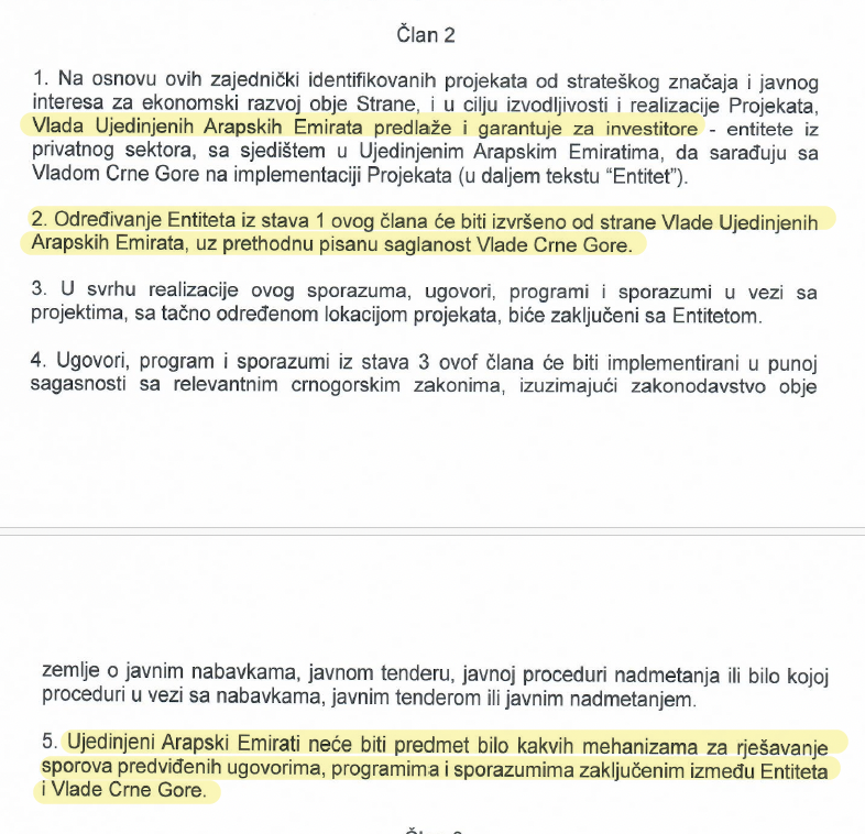Naime, njime se predviđa da Vlada Emirata odredi kompanije čiji projekti će biti predmet Sporazuma, a da crnogorska Vlada na to daje pisanu saglasnost. Međutim, Sporazumom nije predviđeno pod kojim uslovima crnogorska Vlada daje saglasnost, a kada je može uskratiti, posebno u vezi sa utvrđivanjem stvarnih vlasnika firmi i porijeklom kapitala.