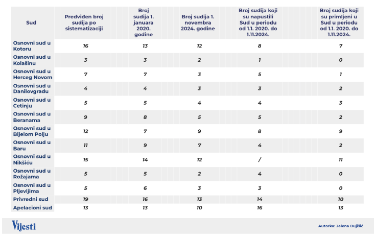 U 11 osnovnih sudova, Apelacionom i Privrednom sudu, u ovom trenutku nedostaje 39 sudija da bi funkcionisali u punom kapacitetu. Sa druge strane, u ovim pravosudnim instancama, u prethodne četiri godine, nijedan sudija nije razrešen dužnosti iako je ove sudove napustilo čak 77 ljudi. Uprkos tome što je u ovom period primljeno 52 sudija, kadrovska popunjenost je lošija nego 1. januara 2020. godine.