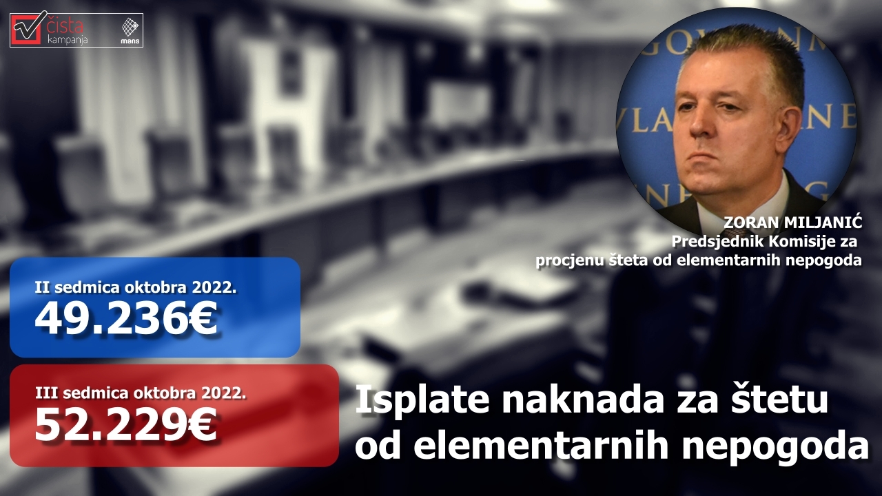 Pomenuta sredstva su isplaćena na osnovu odluka koje je donijela Komisija za procjenu šteta od elementarnih nepogoda na čijem čelu je Zoran Miljanić, ministar bez portfelja, a radi se o 37 pojedinačnih isplata u rasponu od 50 do 5.500 eura.