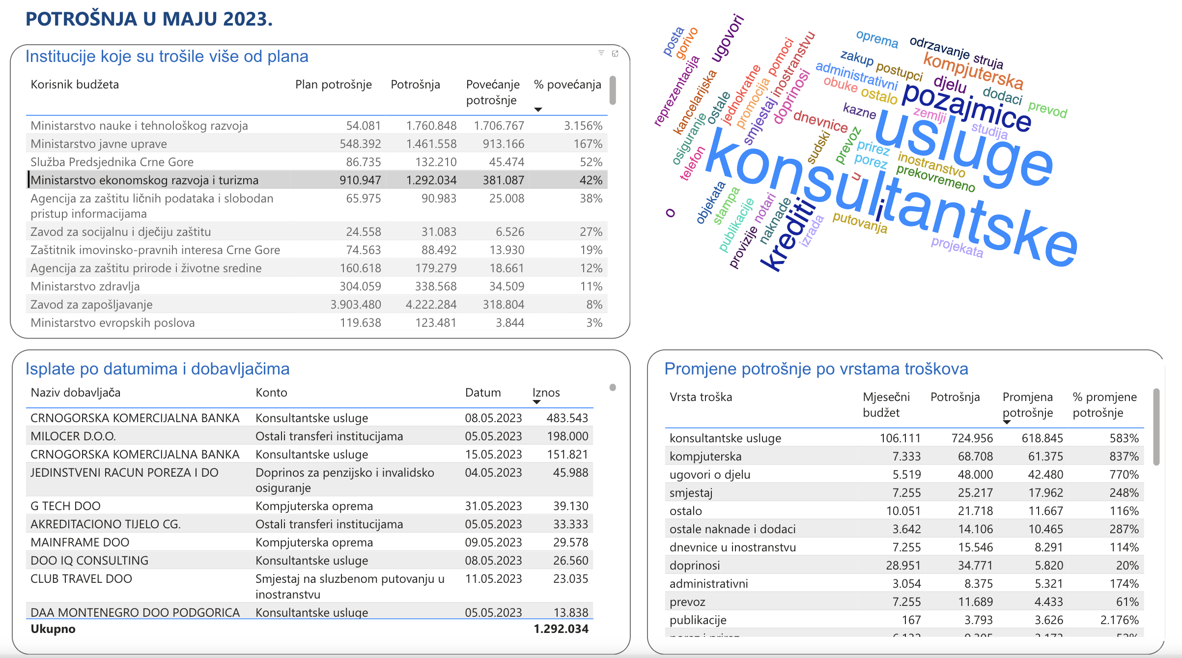 Tako je Ministarstvo javne uprave potrošilo blizu milion eura preko zakonom propisanog limita, od čega je najveći dio otišao na održavanje softvera. Ministarstvo ekonomskog razvoja i turizma je mjesečni limit probilo za blizu 400.000 eura, a najveća stavka u rashodnoj strani za mjesec maj su bile konsultantske usluge. Zanimljivo je da je mjesečni budžet za ugovore o djelu ovog ministarstva iznosio oko 5.500 eura, a da je u maju sa te budžetske linije isplaćeno čak 48 hiljada eura.