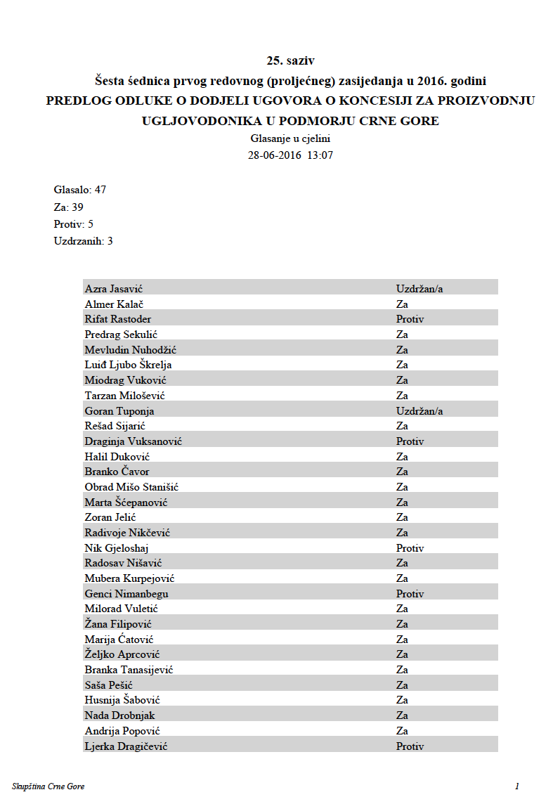 Ugovor sa ENI/Novatek je usvojen krajem juna 2016. godine dominantno glasovima tadašnje vladajuće koalicije, na raspravi na kojoj je opozicija veoma oštro kritikovala namjeru Vlade Crne Gore da, kako su naveli, zaključi još jedan korupcionaški posao koji je štetan po građane.