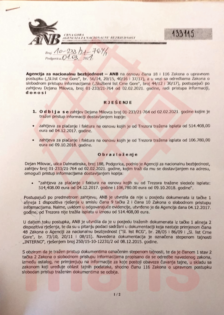 “In the further course of the procedure, ANB determined that it was not in possession of the requested documents, and that the data in question were contained in the documentation resulting from the application of Article 48 of the Law on the National Security Agency… According to decision 250/15-10-12231/2 from 8.12.2015, that documentation is marked with the level of secrecy ‘internal’. Bearing in mind that access to documents marked as classified was requested, and that Article 1, paragraph 2, item 2 of the Law on Free Access to Information stipulates that the provisions of the said law, inter alia, do not apply to information that must be kept secret, in accordance with the law regulating the field of classified information, pursuant to Article 116 of the Law on Administrative Procedure, free access to the requested information is denied”, it is stated in the decision submitted to MANS, signed by the acting director of ANB, Dejan Vukšić.