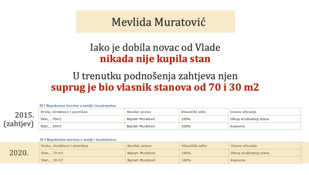 Mevlida Muratović, a judge of the Constitutional Court, received 40,000 euros and never bought an apartment, while her husband already had two apartments.