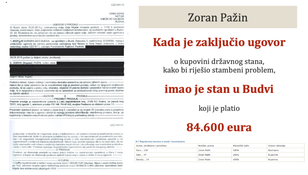 Zoran Pažin replaced an apartment of 73 m2 for an apartment of over 128 m2. He already had an apartment in Budva that he had paid 84,600 euros, while he did not have the money to solve the housing issue in Podgorica, she pointed out.