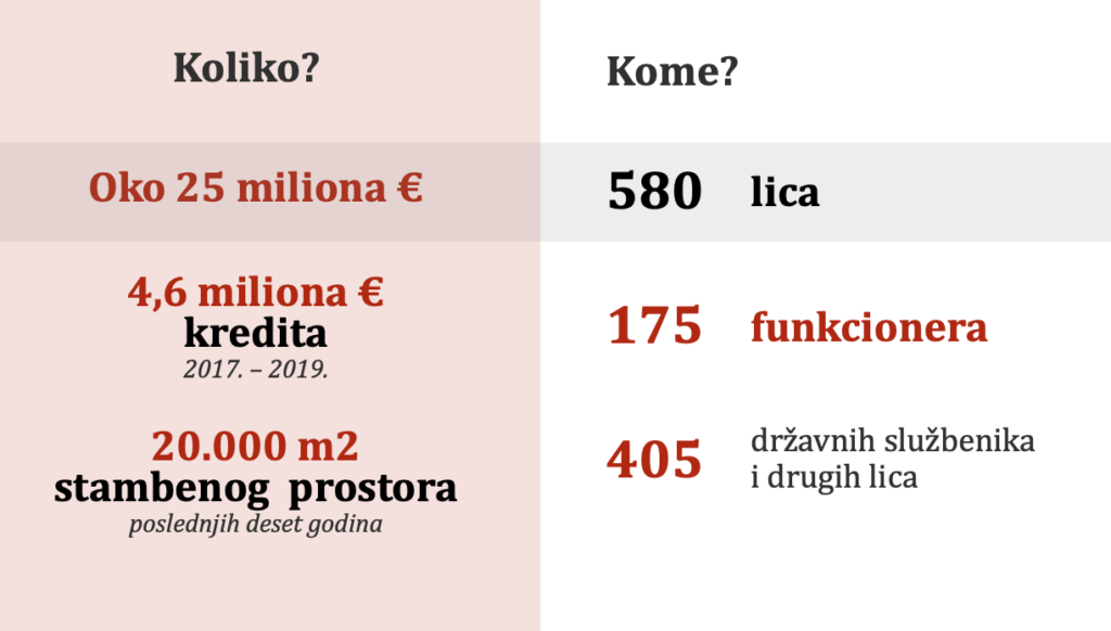 She said that at least 175 officials, out of a total of 580, received aid in this way. Around 25 million euros was distributed to them. According to Ćalović Marković, the commission granted housing loans to public officials without advertising.