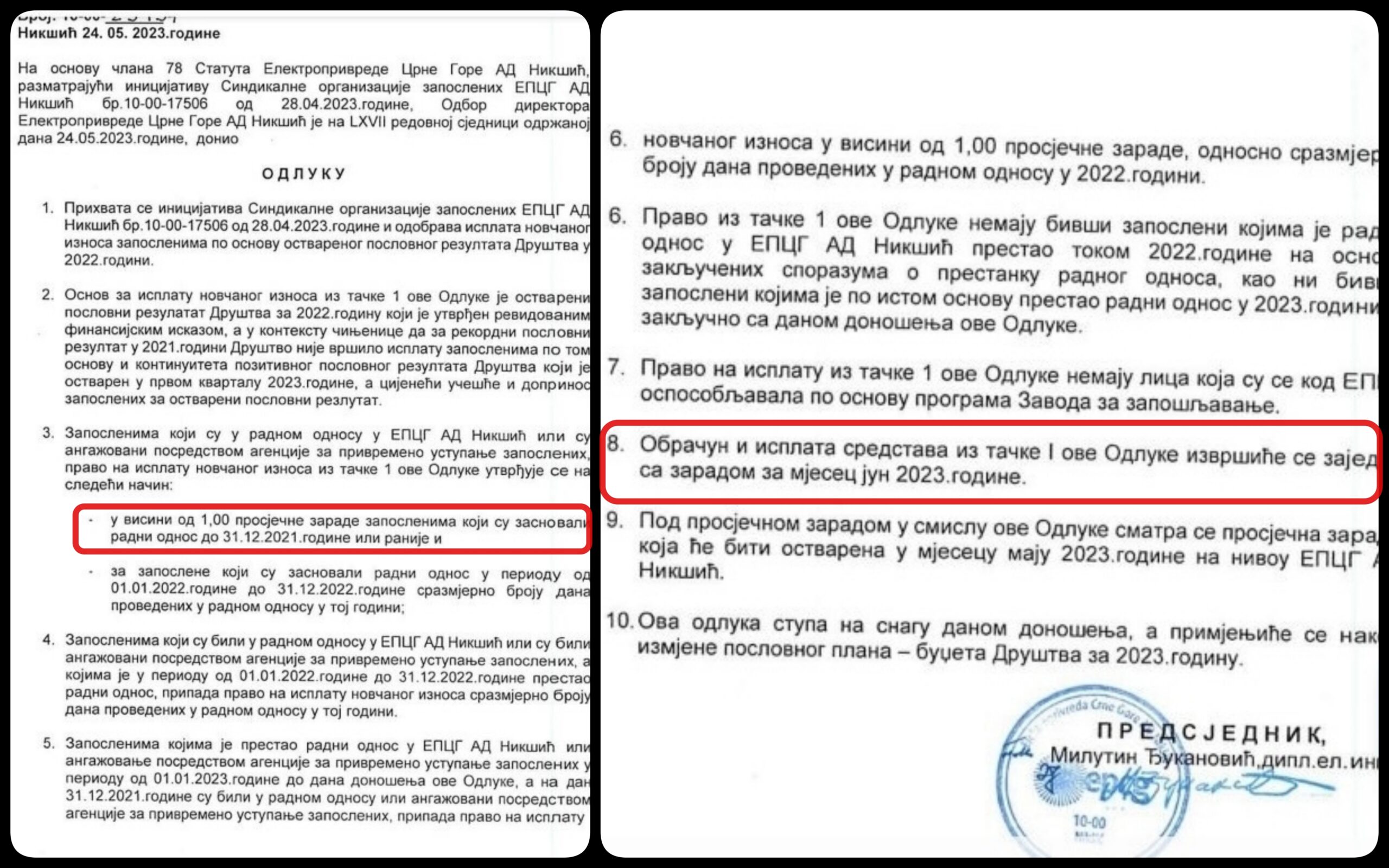 On May 24, two weeks before the parliamentary elections, the Board of Directors made a decision on the payment of the aforementioned bonus, in the amount of the average salary at the level of EPCG. Point 8 of the aforementioned decision defines that the aforementioned compensation will be paid to the workers in addition to the June salary, which was also not denied by the EPCG management.