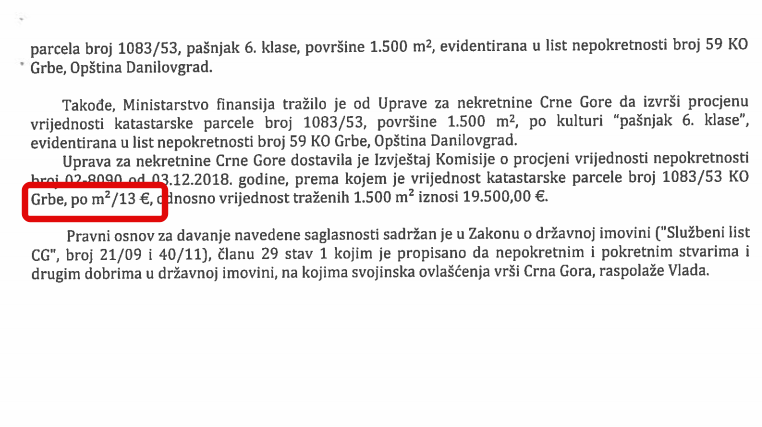Posjed Milivoja Katnića proširen je u oktobru prošle godine, nakon što je njegova supruga sa Upravom za imovinu zaključila ugovor o kupovini blizu 4.000m2 po cijeni od oko 22 hiljade eura, odnosno 5,5 eura po m2. Odluku da se državna parcela proda po ovoj cijeni i to na rate kroz 10 godina, donijela je Vlada Duška Markovića u septembru prošle godine, kada je već bila u tzv. tehničkom mandatu.