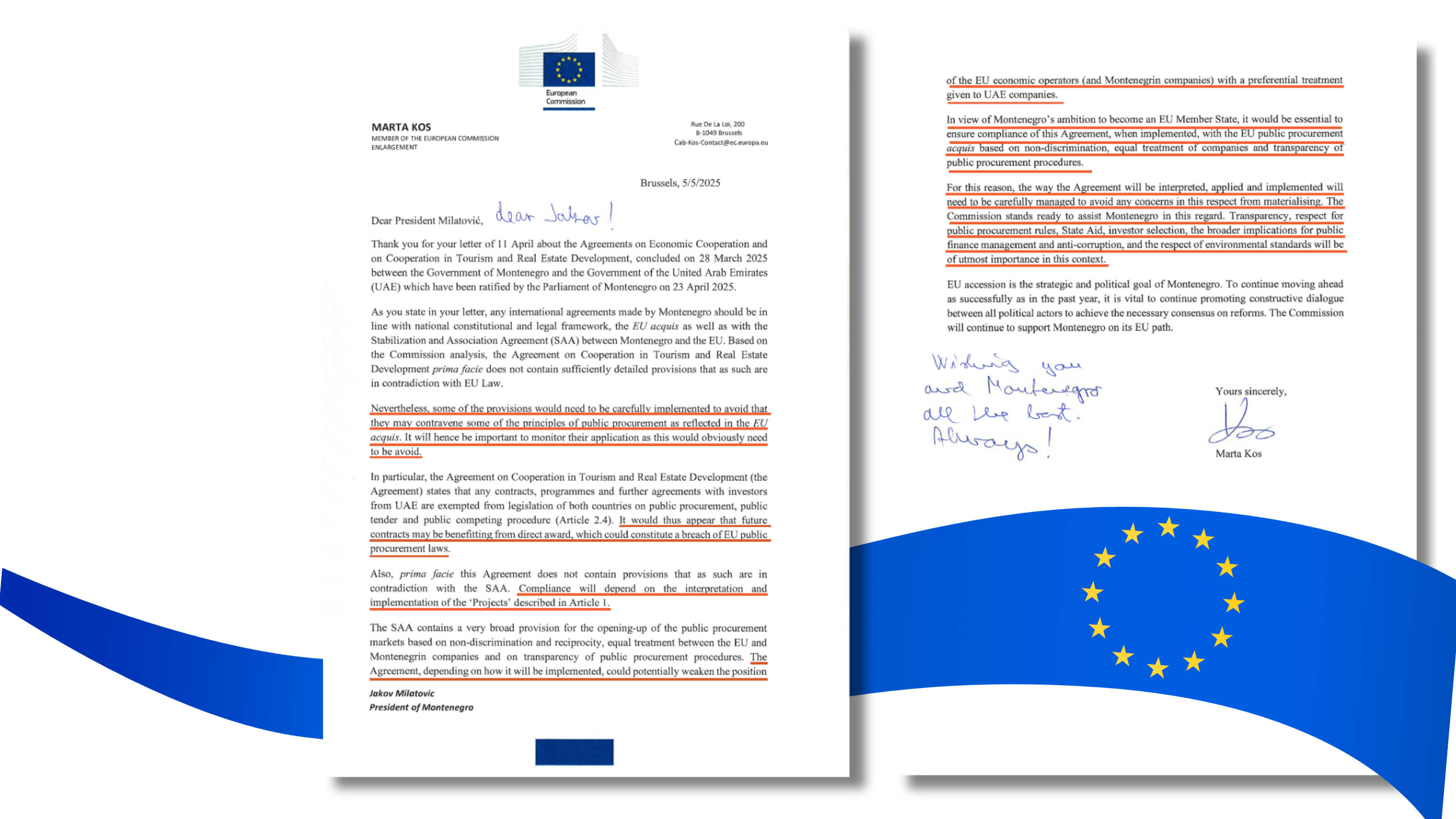 Evropska komisija ni u jednom dijelu mišljenja nije dala zeleno svjetlo Sporazumu, već naprotiv – jasno je ukazala da bi njegova primjena predstavljala direktno kršenje evropskih pravila, a samim tim i ugrožavanje procesa pridruživanja Crne Gore EU. Upravo član 2.4 Sporazuma, koji sama Komisija i citira, predviđa izuzeće od obaveze raspisivanja javnih tendera. EU jasno kaže da bi sprovođenje tog člana bilo u suprotnosti sa principima transparentnosti, konkurencije i jednakog tretmana svih investitora.